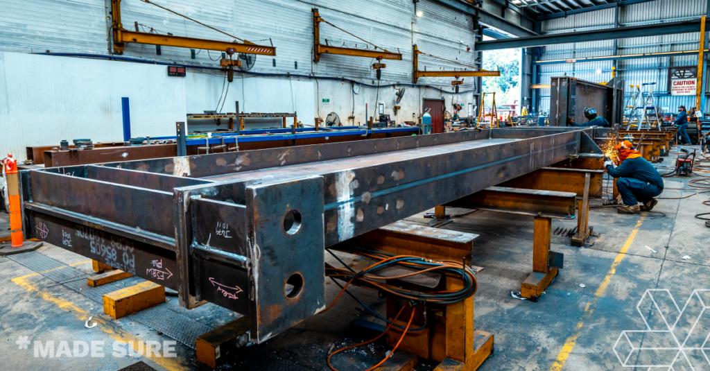 Sub-arc welding was undertaken with careful planning around handling and positioning. The works also involved large butt welds at the endplate connections, and tight dimensional tolerances required a trial assembly in our workshop to confirm the crane stub would fit correctly.